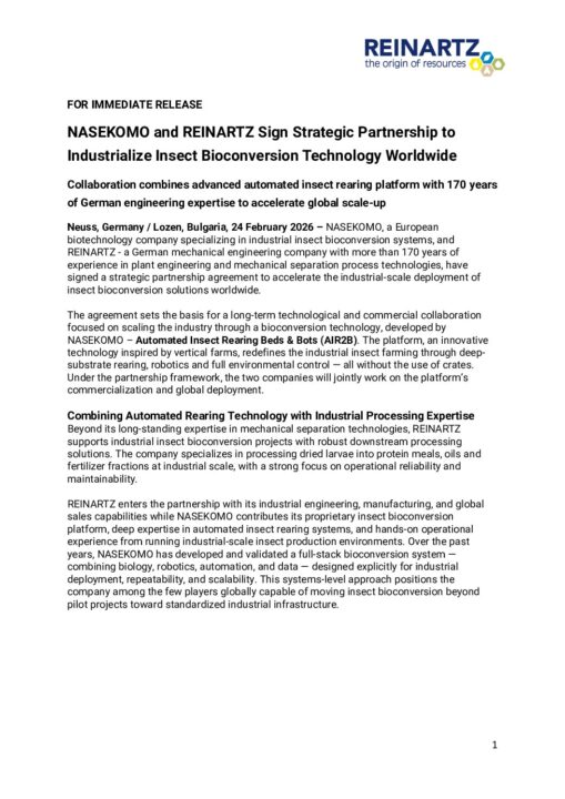 Press release NASEKOMO and REINARTZ Sign Strategic Partnership to Industrialize Insect Bioconversion Technology